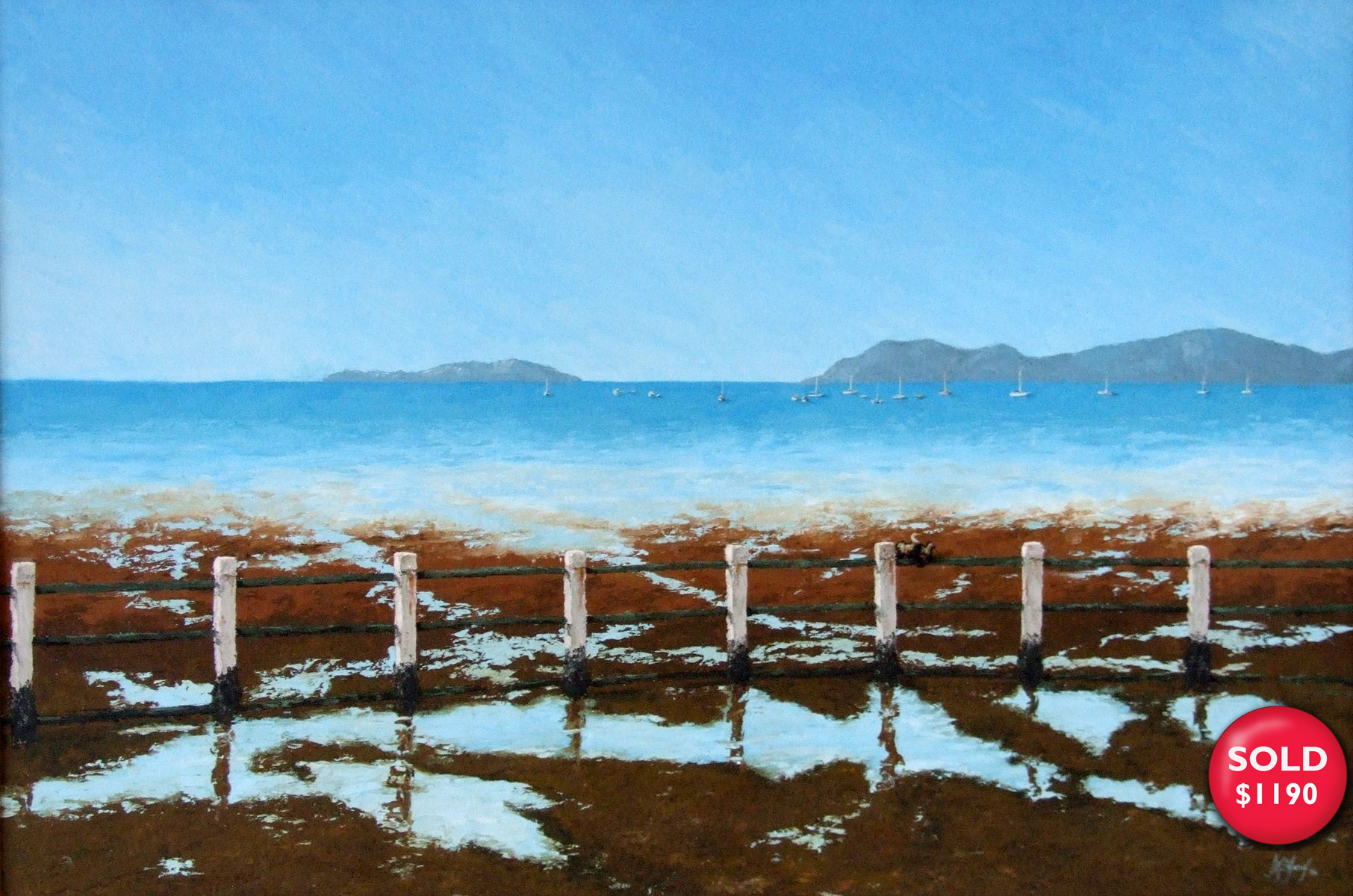 Cannonvale Whitsundays, Queensland. Swimming enclosure in 1994 Darter on the fence. Palette knife painting in oils on canvas. 90cm x 59cm