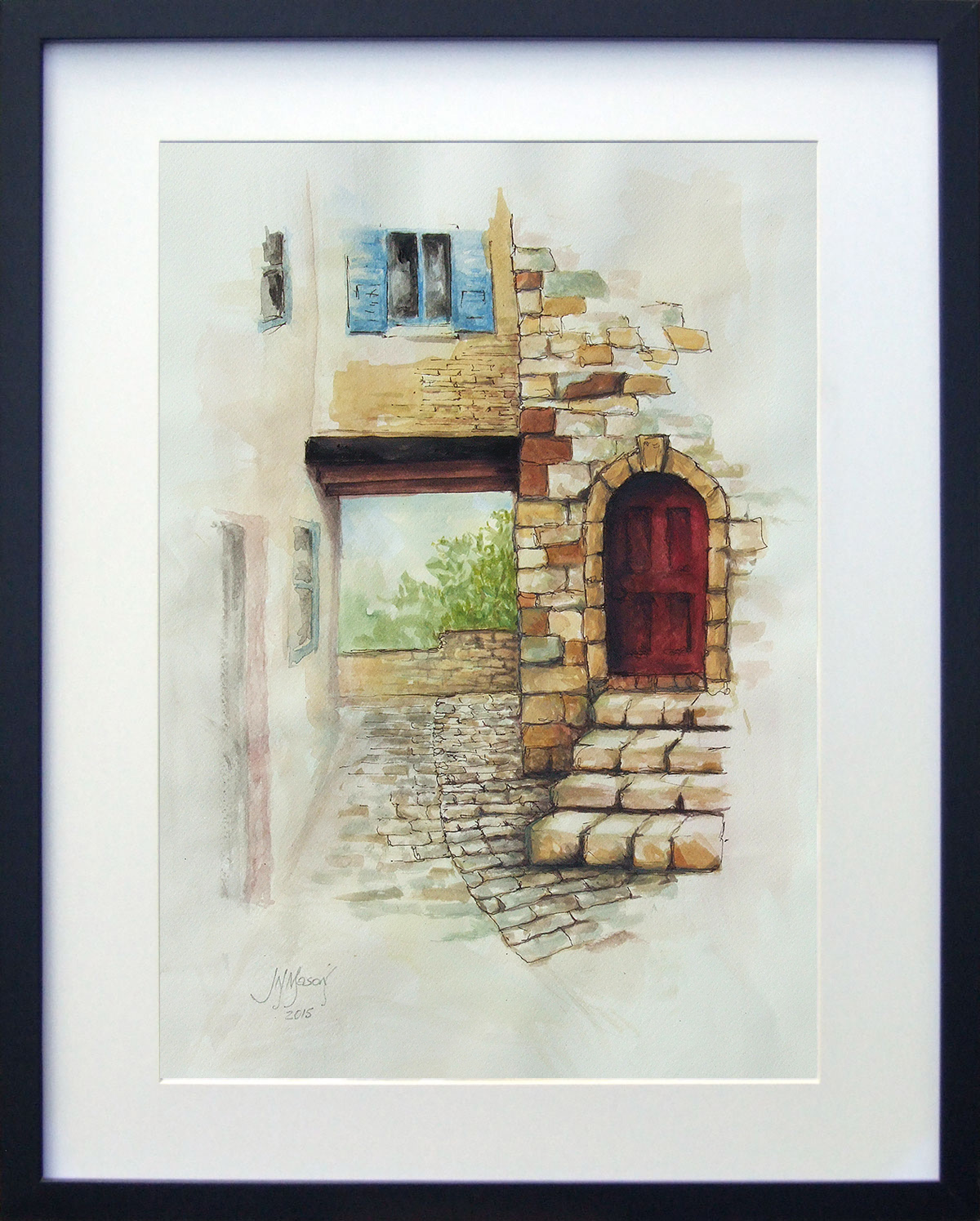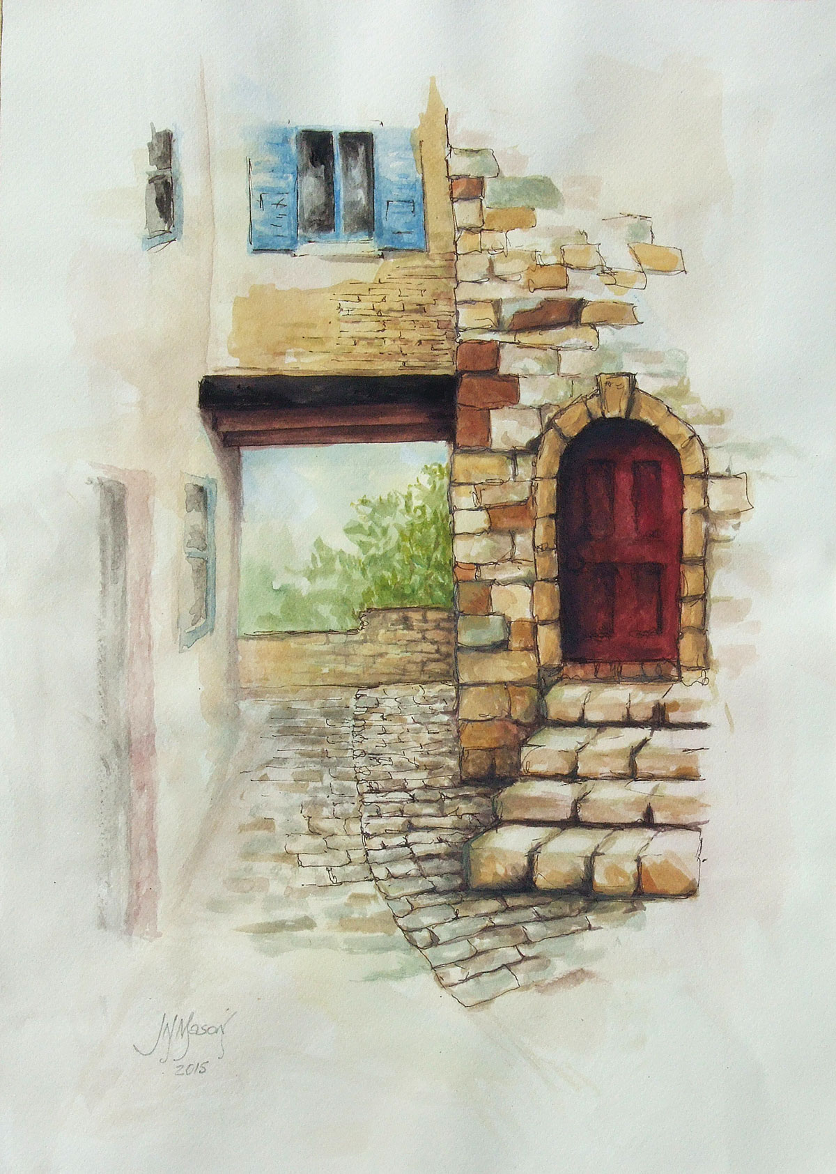 Imagined Italian cobblestone alley way. Acrylic painted in the style of watercolours but with the durability of Artelier Interactive Acrylic paints. Unframed