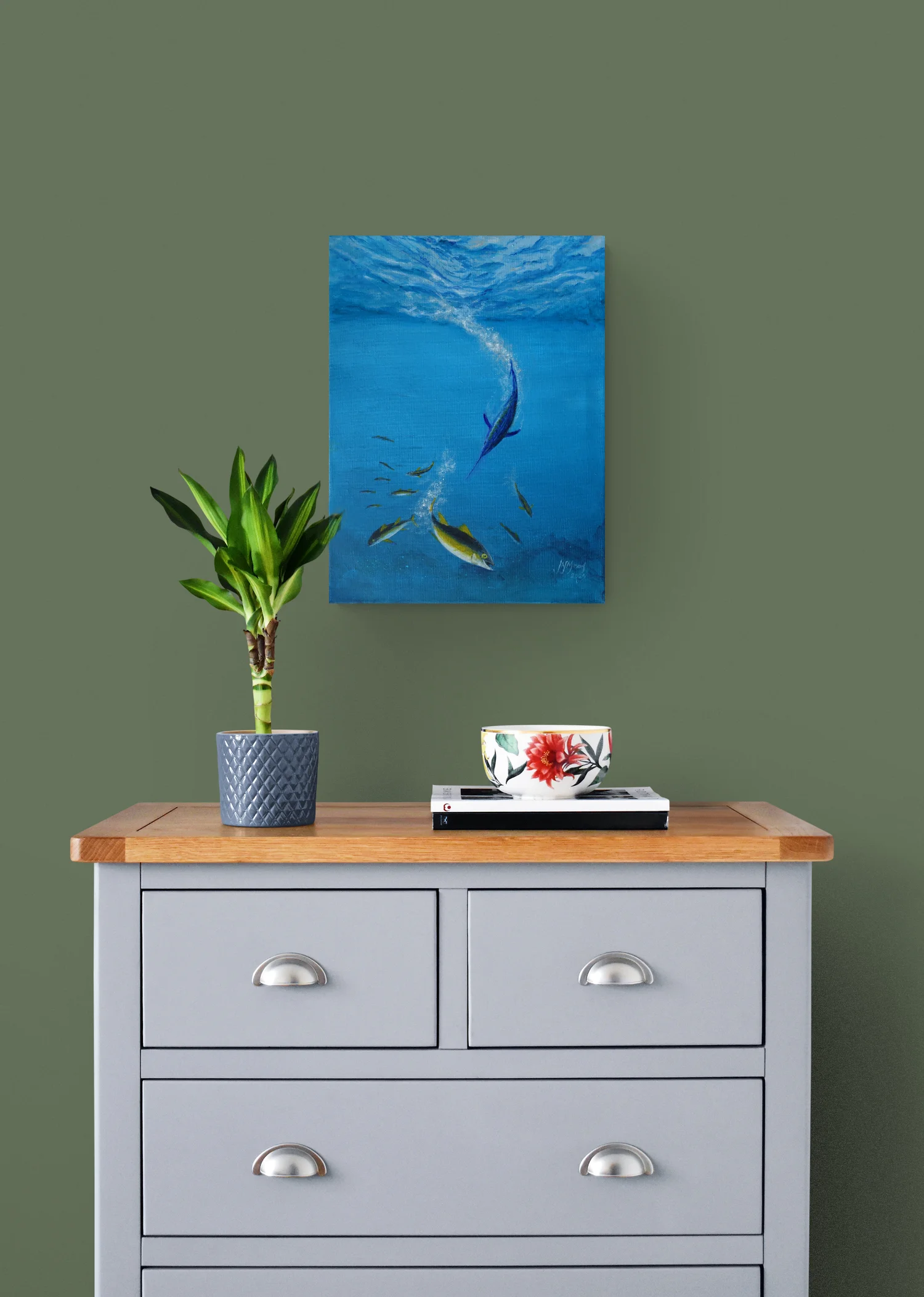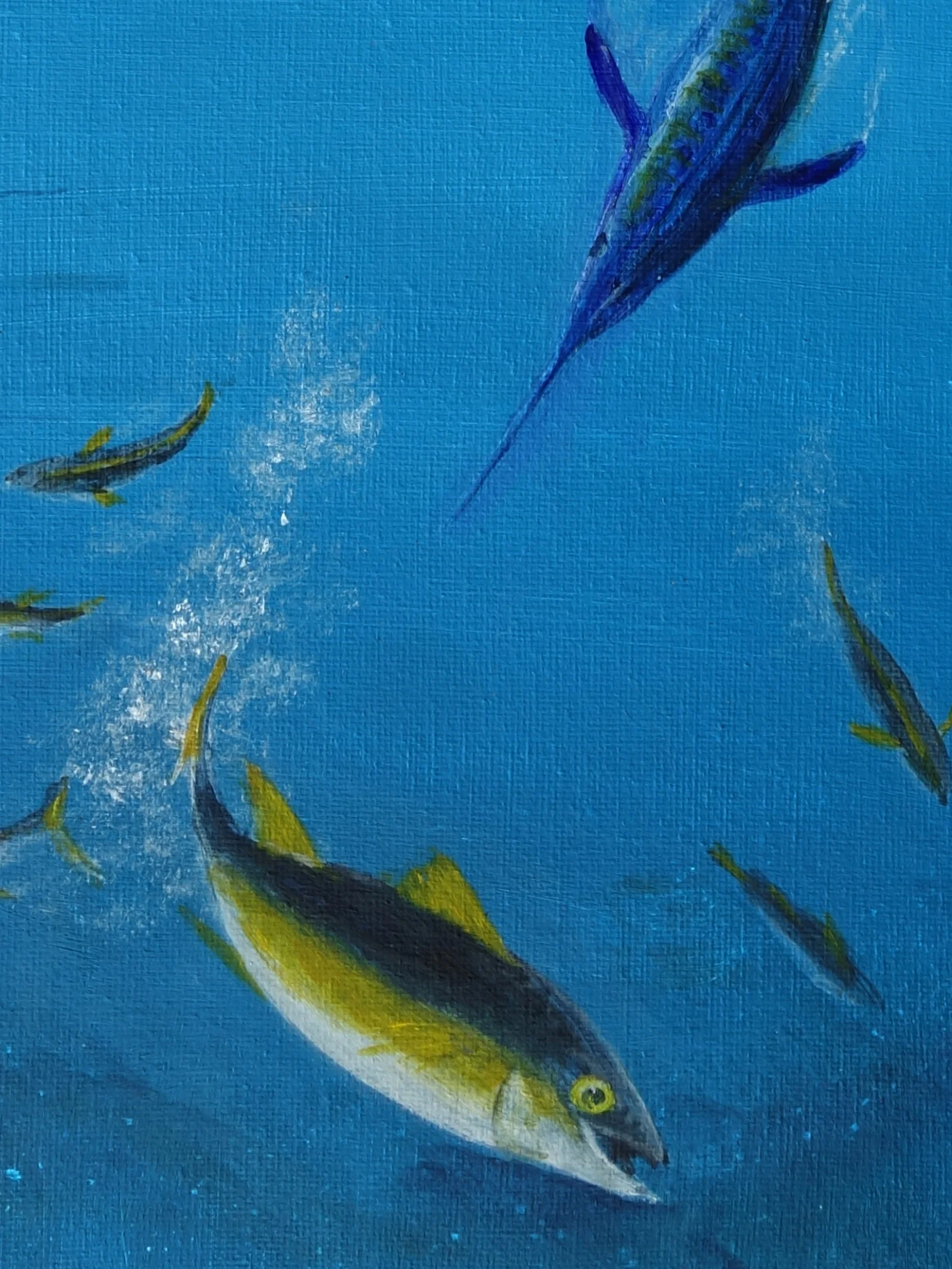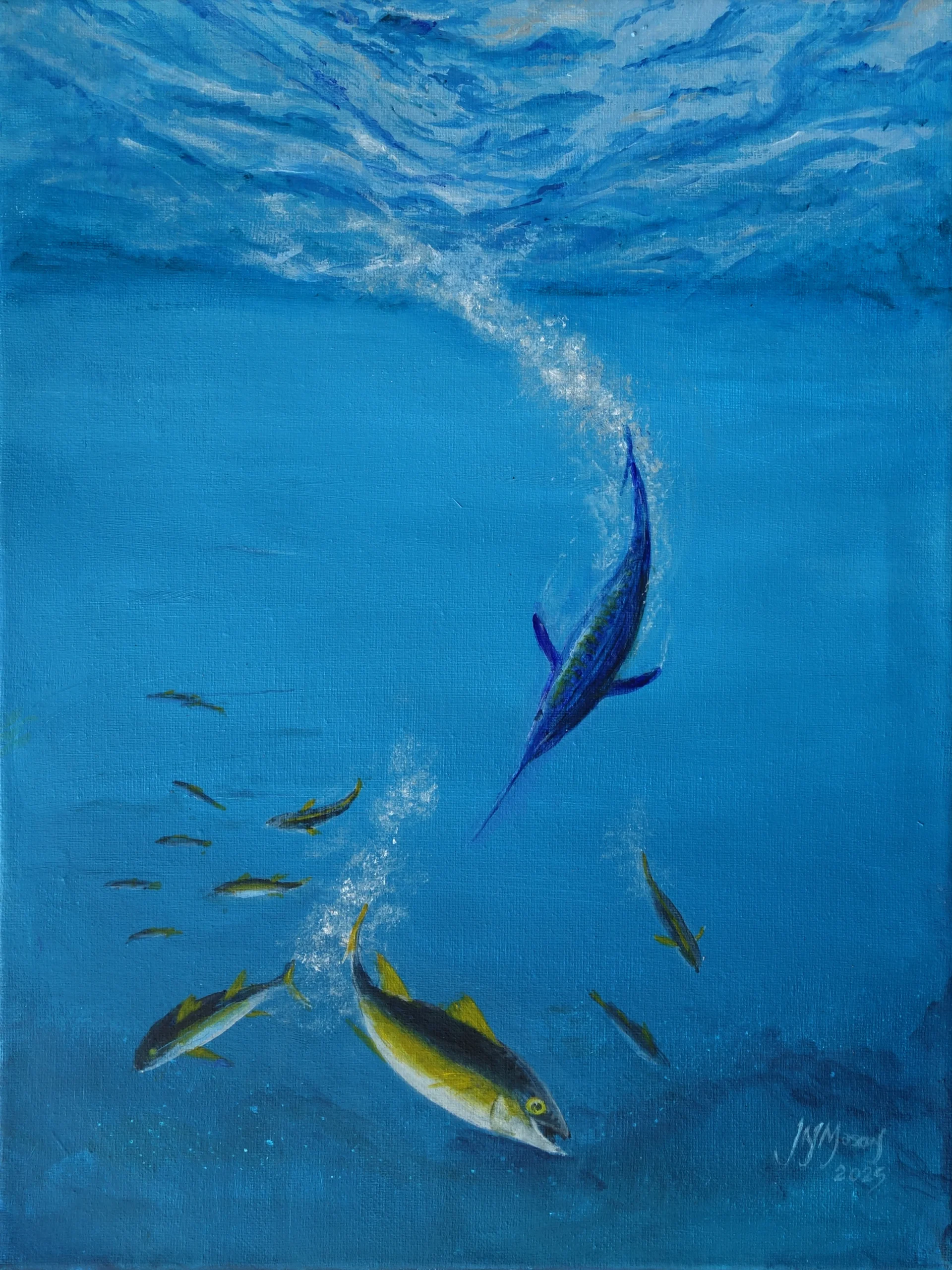 An imagined scene on the Great Barrier Reef when a Pacific Blue Marlin chases its favourite food, Yellow Fin Tuna.