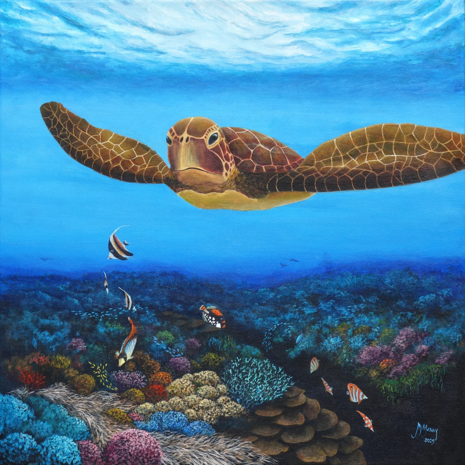 Tags: coral, Fish, Great Barrier Reef, John N Mason artist, Sea turtle, Turtle, Underwater