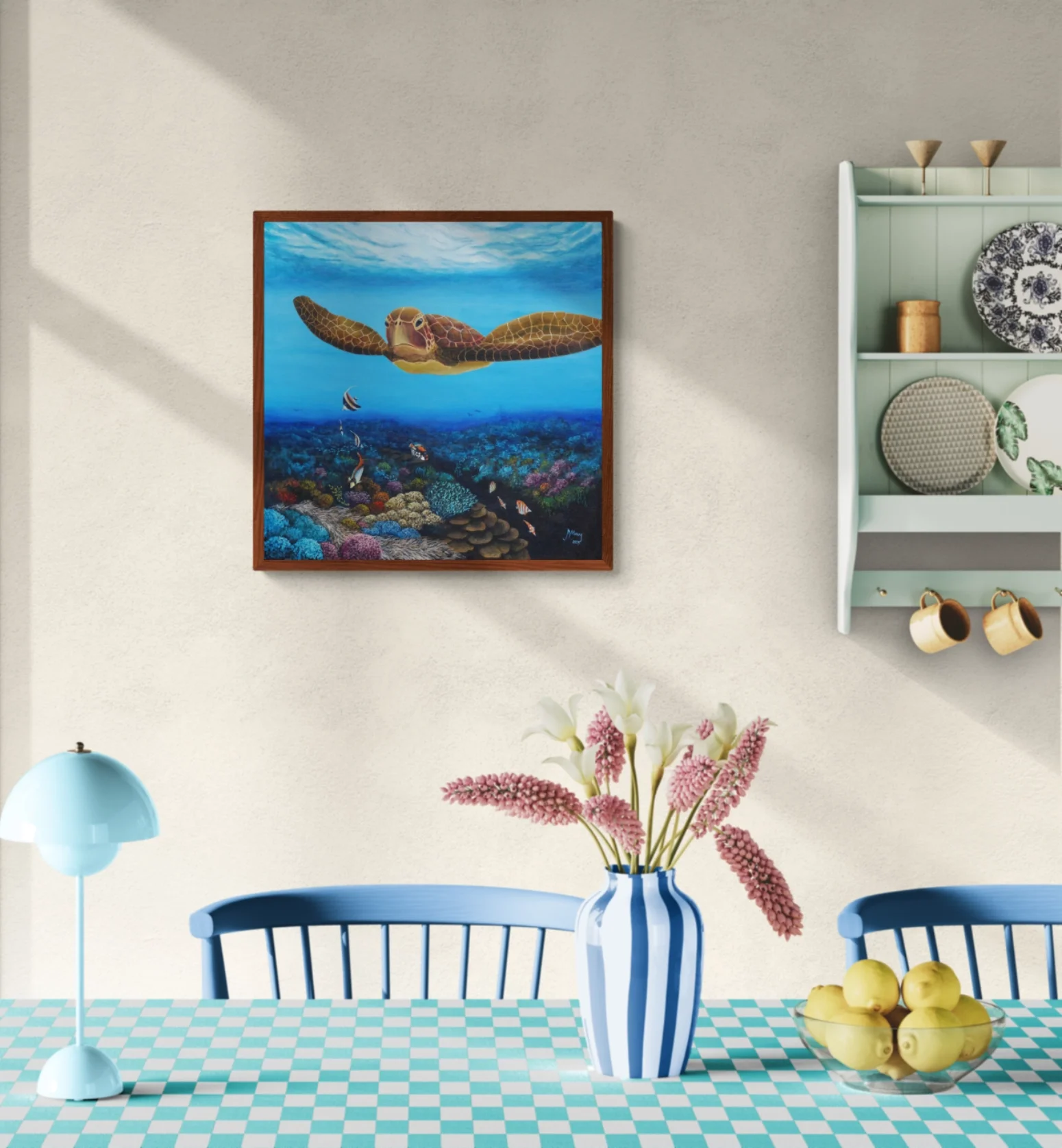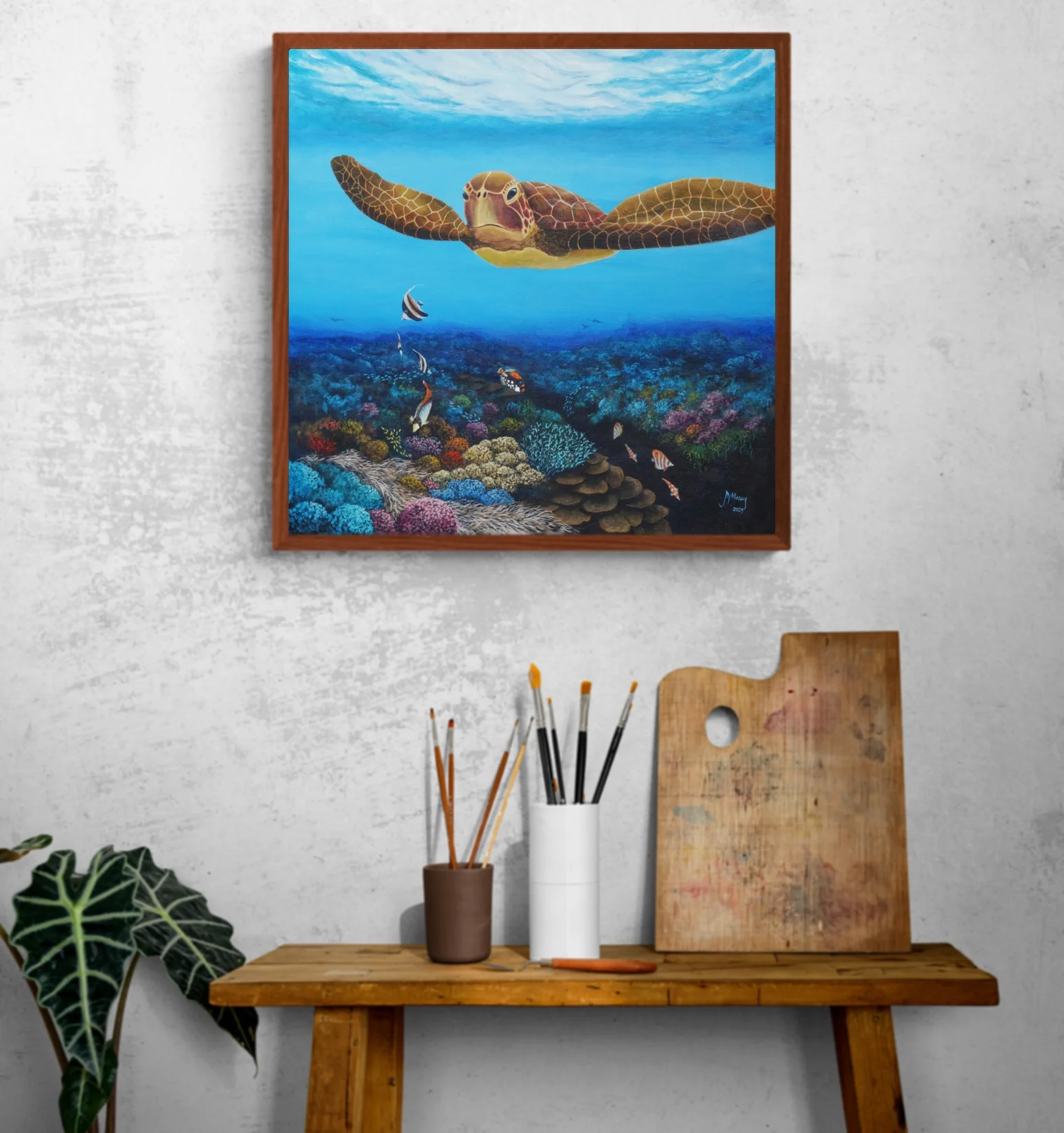 Sea Turtle Tina gliding across the Great Barrier Reef. A Sea Turtle in an imagined Great Barrier Reef scene with various reef fish. Beaked coralfish, Lined Butterflyfish, Morish Idol fish, and Triggerfish, all native to the Great Barrier Reef.